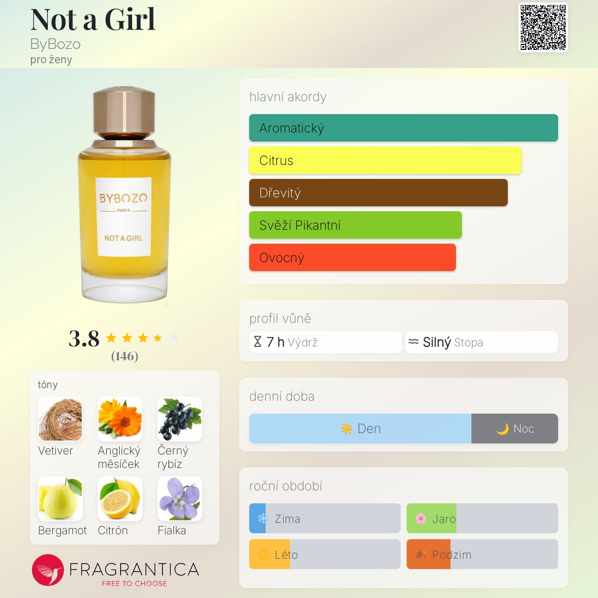 Not a Girl podle ByBozo je Orientální Woody vůně pro ženy. Not a Girl byl/a uveden/a v roce 2021. "Nosem" za touto vůní je Paul Emilien. Vrchní tóny jsou Měsíček, Černý rybíz, Bergamot, Citrón a Pomeranč; střední tóny jsouFialka, Jasmín a Brambořík ; základní tóny jsou Vetiver, Pižmo, Virginský cedr a Ambra.