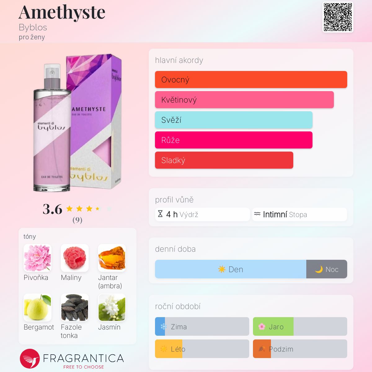 Amethyste podle Byblos je vůně pro ženy. Vrchní tóny jsou Pivoňka, Maliny a Bergamot; střední tóny jsouFazole tonka, Jasmín a Fialka ; základní tóny jsou Jantar (ambra), Pižmo a Vetiver.