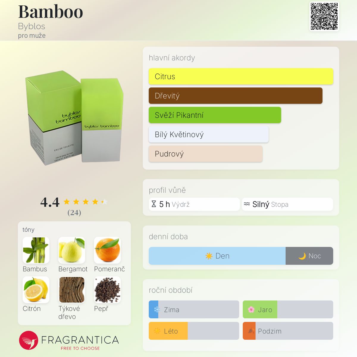 Bamboo podle Byblos je Woody Aromatic vůně pro muže. Bamboo byl/a uveden/a v roce 2004. Vrchní tóny jsou Bergamot, Pomeranč, Citron amalfi a Pepř; střední tóny jsouBambus, Jasmín, Konvalinka a Fialka ; základní tóny jsou Týkové dřevo, Santalové dřevo a Pižmo.