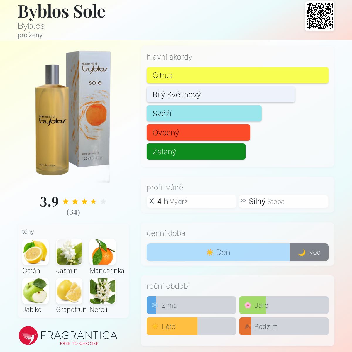 Byblos Sole podle Byblos je Floral Woody Musk vůně pro ženy. Byblos Sole byl/a uveden/a v roce 2014. Vrchní tóny jsou Citrón, Mandarinka, Jablko a Grapefruit; střední tóny jsouJasmín, Neroli, Tuberóza, Zázvor a Bílé květy ; základní tóny jsou Pižmo, Cedr, Sněženky a Santalové dřevo.