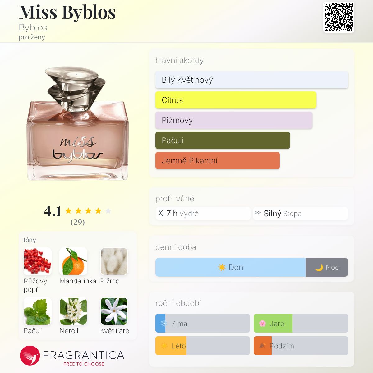 Miss Byblos podle Byblos je Floral vůně pro ženy. Miss Byblos byl/a uveden/a v roce 2012. Vrchní tóny jsou Růžový pepř, Mandarinka a Neroli; střední tóny jsouKvět tiare, Konvalinka a Tuberóza ; základní tóny jsou Pižmo, Pačuli a Jantar (ambra).