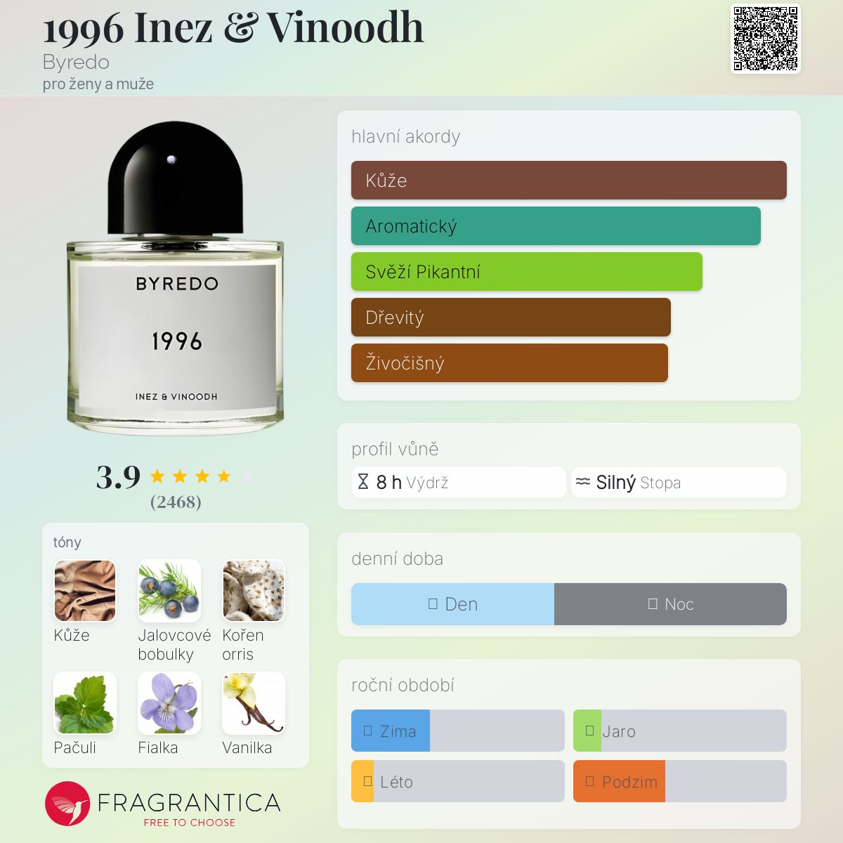 1996 Inez & Vinoodh podle Byredo je Orientální Woody vůně pro ženy a muže. 1996 Inez & Vinoodh byl/a uveden/a v roce 2013. Vrchní tóny jsou Jalovcové bobulky a Černý pepř; střední tóny jsouKůže, Orris a Fialka ; základní tóny jsou Pačuli, Černý jantar a Vanilka.