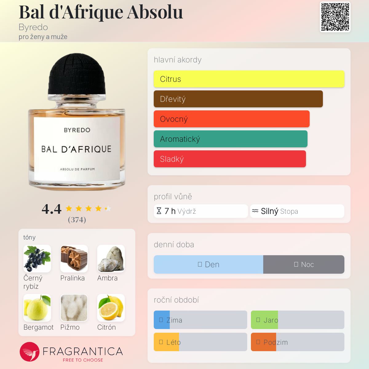 Bal d'Afrique Absolu podle Byredo je Floral Woody Musk vůně pro ženy a muže. Toto je nová vůně. Bal d'Afrique Absolu byl/a uveden/a v roce 2025. "Nosem" za touto vůní je Jerome Epinette. Vrchní tóny jsou Černý rybíz, Bergamot a Citrón; střední tóny jsouPralinka, Pižmo a Fialka ; základní tóny jsou Černý jantar, Cedr a Vetiver.