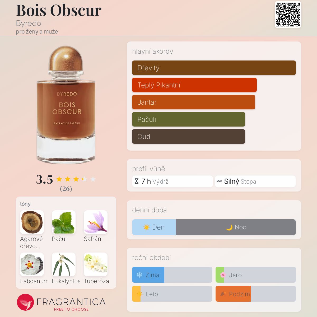 Bois Obscur podle Byredo je Orientální Woody vůně pro ženy a muže. Toto je nová vůně. Bois Obscur byl/a uveden/a v roce 2025. Vrchní tóny jsou Šafrán, Eukalyptus a Papyrus; střední tóny jsouAgarové dřevo (oud), Tuberóza a Jasmín ; základní tóny jsou Pačuli, Labdanum, Jantar (ambra) a Santalové dřevo.