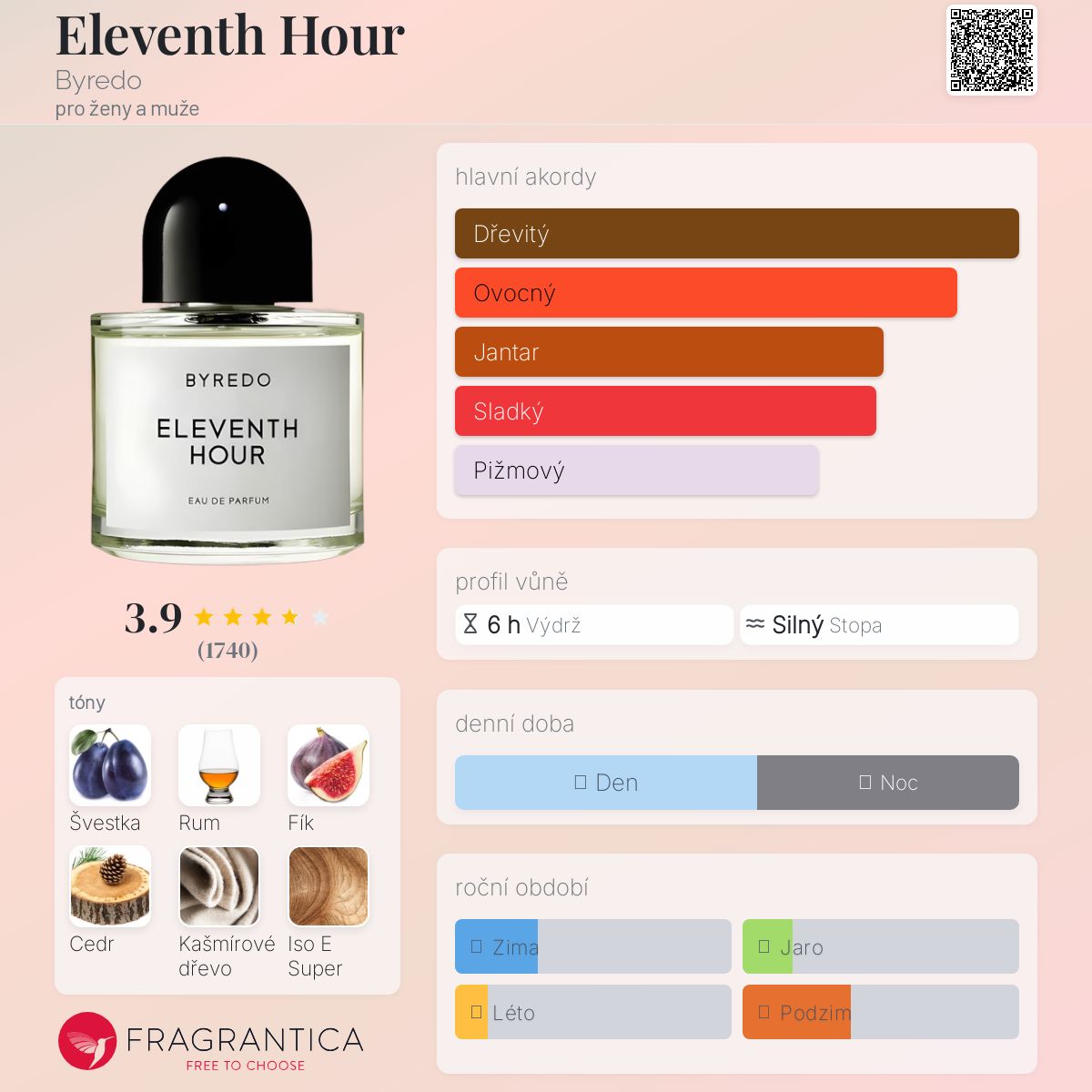 Eleventh Hour podle Byredo je Woody Aromatic vůně pro ženy a muže. Eleventh Hour byl/a uveden/a v roce 2018. "Nosem" za touto vůní je Jérôme Epinette. Vrchní tóny jsou Bergamot a Timur; střední tóny jsouŠvestka, Rum, Fík a Semena mrkve ; základní tóny jsou Cedr, Kašmírové dřevo, Iso E Super, Fazole tonka, Olibanum a Labdanum.