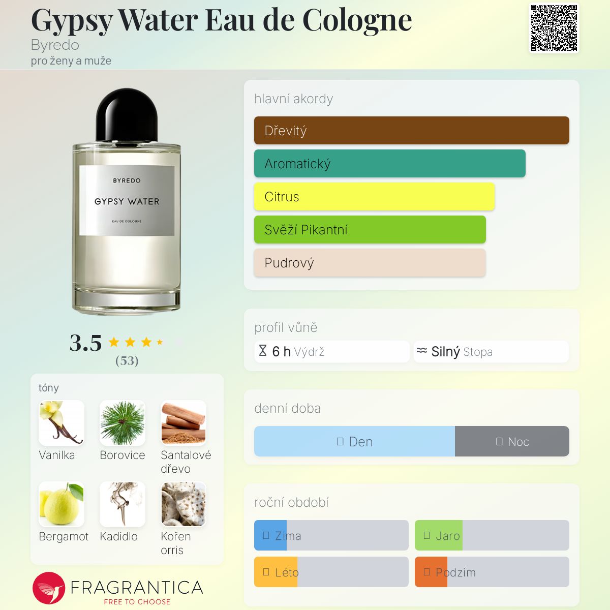 Gypsy Water Eau de Cologne podle Byredo je Woody Aromatic vůně pro ženy a muže. Gypsy Water Eau de Cologne byl/a uveden/a v roce 2014. Vrchní tóny jsou Bergamot, Citrón, Jalovcové bobulky a Pepř; střední tóny jsouBorovice, Kadidlo a Kořen orris ; základní tóny jsou Vanilka, Santalové dřevo a Jantar (ambra).