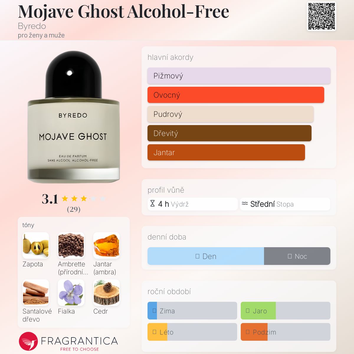 Mojave Ghost Alcohol-Free podle Byredo je vůně pro ženy a muže. Mojave Ghost Alcohol-Free byl/a uveden/a v roce 2024. Vrchní tóny jsou Zapota a Ambrette (přírodní pižmo); střední tóny jsouSantalové dřevo, Fialka a Magnólie ; základní tóny jsou Jantar (ambra), Cedr a Pižmo.
