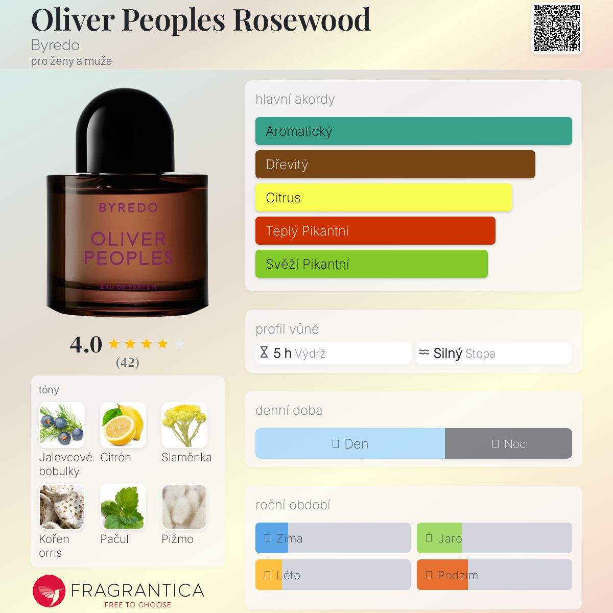 Oliver Peoples Rosewood podle Byredo je Woody Aromatic vůně pro ženy a muže. Oliver Peoples Rosewood byl/a uveden/a v roce 2016. Vrchní tóny jsou Jalovcové bobulky a Kalifornský citrón; střední tóny jsouOrris a Pačuli ; základní tóny jsou Slaměnka, Pižmo a Písek.