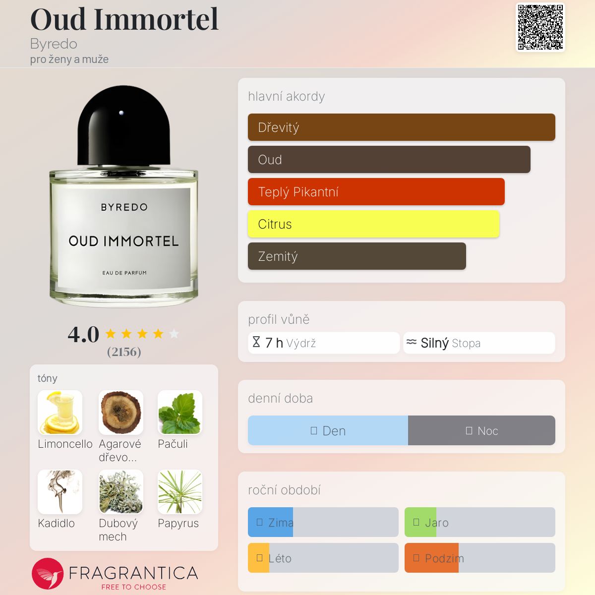 Oud Immortel podle Byredo je Woody Chypre vůně pro ženy a muže. Oud Immortel byl/a uveden/a v roce 2010. Vrchní tóny jsou Limoncello, Kadidlo a Kardamom; střední tóny jsouAgarové dřevo (oud), Pačuli, Papyrus a Brazilské růžové dřevo ; základní tóny jsou Dubový mech a Tabák.