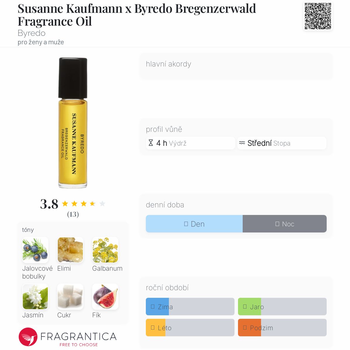 Susanne Kaufmann x Byredo Bregenzerwald Fragrance Oil podle Byredo je Aromatic Green vůně pro ženy a muže. Susanne Kaufmann x Byredo Bregenzerwald Fragrance Oil byl/a uveden/a v roce 2023. Vrchní tóny jsou Jalovcové bobulky a Elimi; střední tóny jsouGalbanum a Jasmín ; základní tóny jsou Cukr a Fík.
