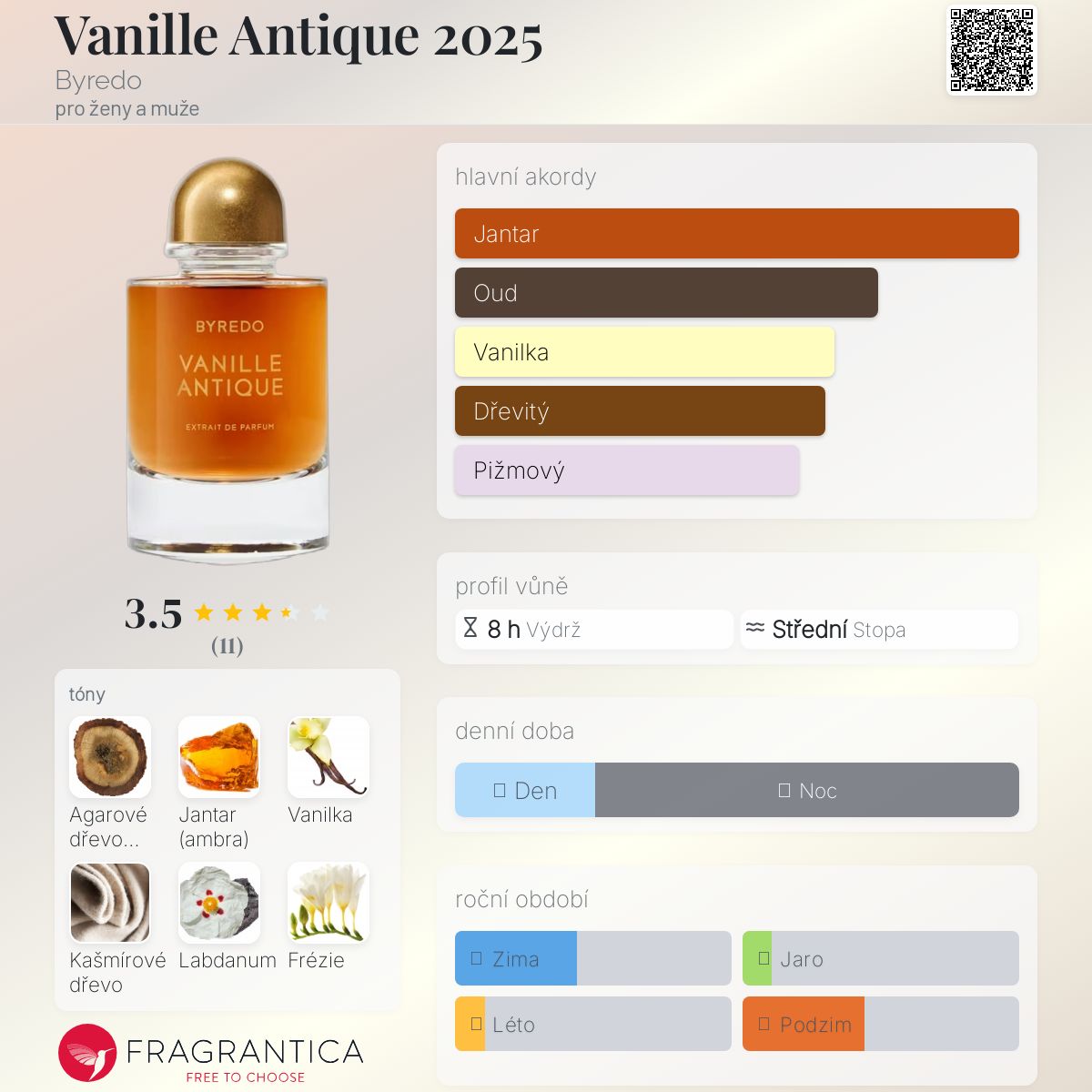 Vanille Antique 2025 podle Byredo je Orientální Vanilla vůně pro ženy a muže. Toto je nová vůně. Vanille Antique 2025 byl/a uveden/a v roce 2025. Vrchní tóny jsou Frézie a Švestka; střední tóny jsouAgarové dřevo (oud), Jantar (ambra), Kašmírové dřevo a Tuberóza ; základní tóny jsou Madagaskarská vanilka a Labdanum.