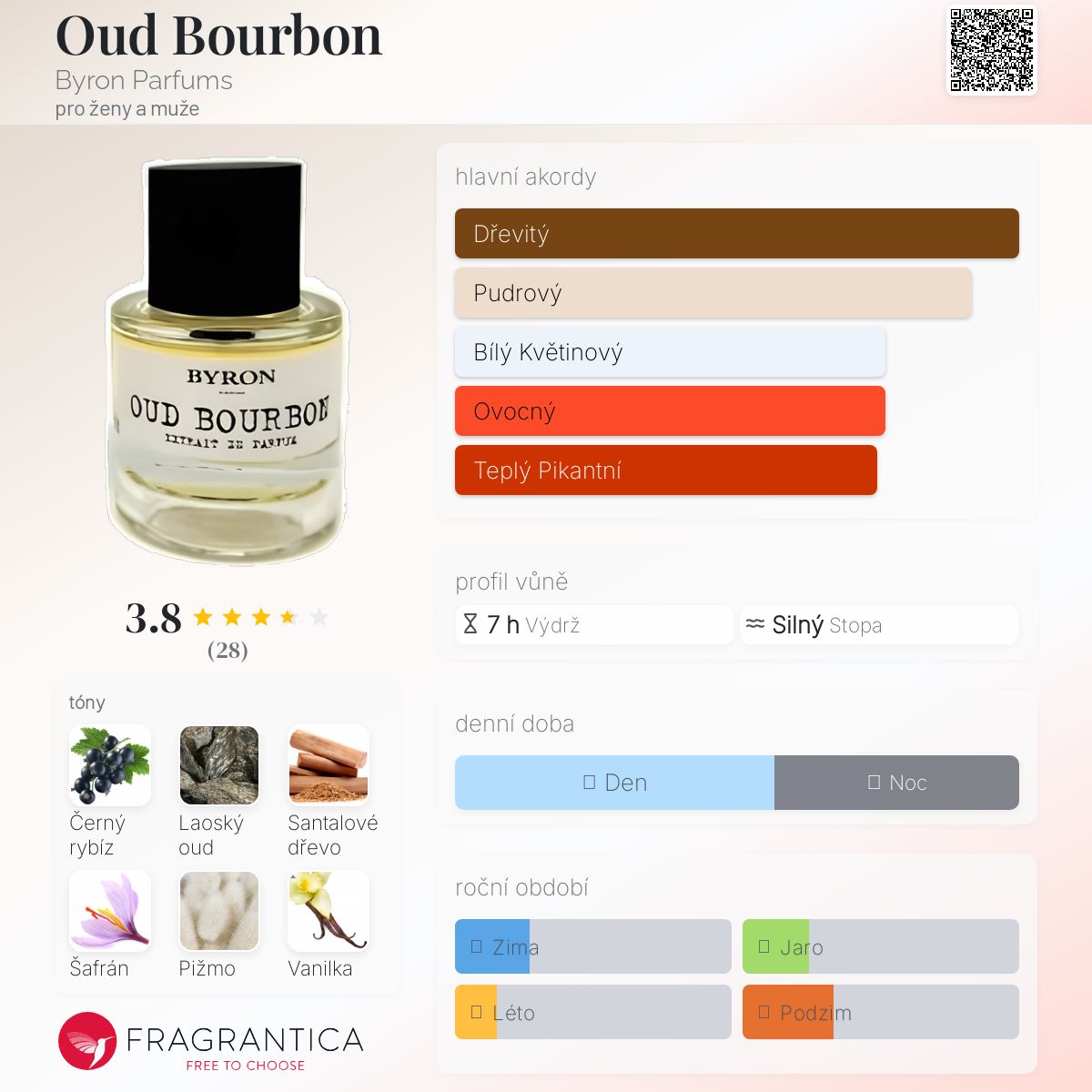 Oud Bourbon podle Byron Parfums je Floral Woody Musk vůně pro ženy a muže. Oud Bourbon byl/a uveden/a v roce 2019. Vrchní tóny jsou Šafrán, Fialka a Neroli; střední tóny jsouČerný rybíz, Vanilka a Jasmín ; základní tóny jsou Laoský oud, Santalové dřevo a Pižmo.