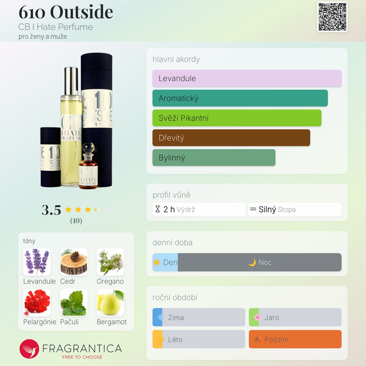 610 Outside podle CB I Hate Perfume je Citrus Aromatic vůně pro ženy a muže. 610 Outside byl/a uveden/a v roce 2013. "Nosem" za touto vůní je Christopher Brosius.