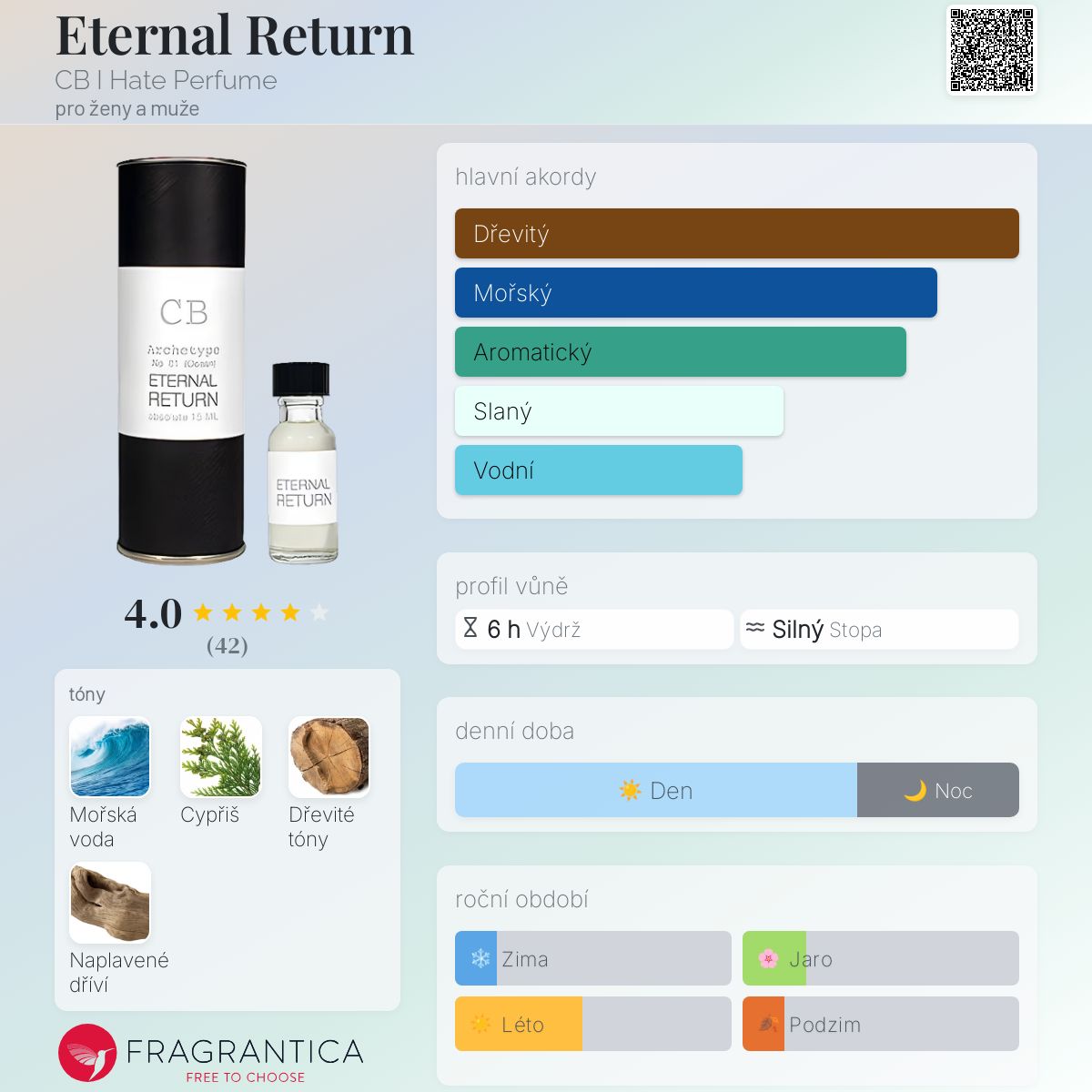 Eternal Return podle CB I Hate Perfume je Woody Aquatic vůně pro ženy a muže. Eternal Return byl/a uveden/a v roce 2007. "Nosem" za touto vůní je Christopher Brosius.