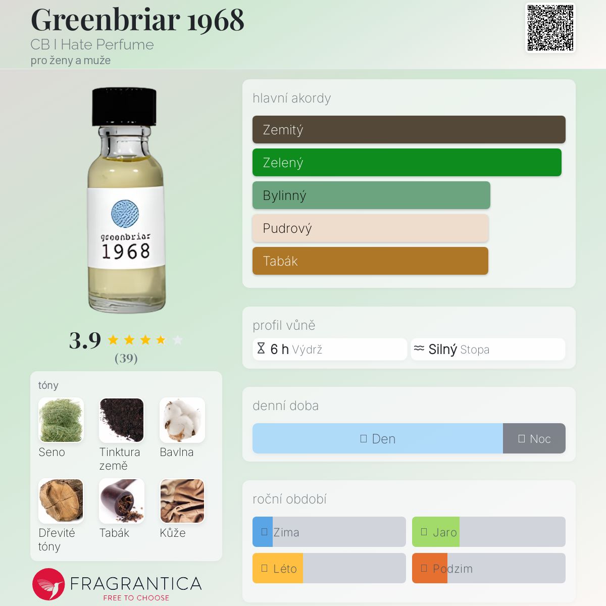Greenbriar 1968 podle CB I Hate Perfume je Woody Aromatic vůně pro ženy a muže. Greenbriar 1968 byl/a uveden/a v roce 2007. "Nosem" za touto vůní je Christopher Brosius.