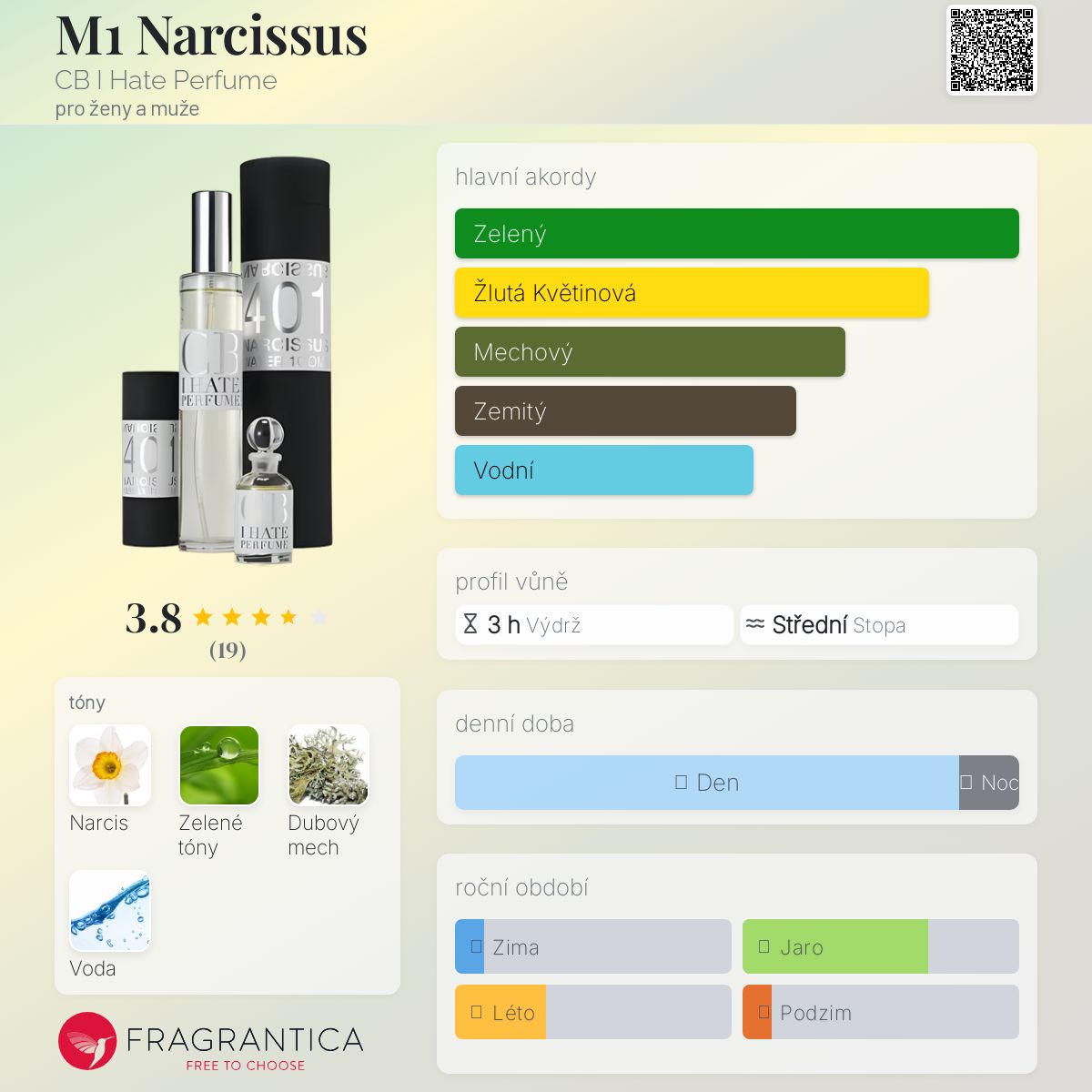 M1 Narcissus podle CB I Hate Perfume je Floral Aquatic vůně pro ženy a muže. M1 Narcissus byl/a uveden/a v roce 2004. "Nosem" za touto vůní je Christopher Brosius.