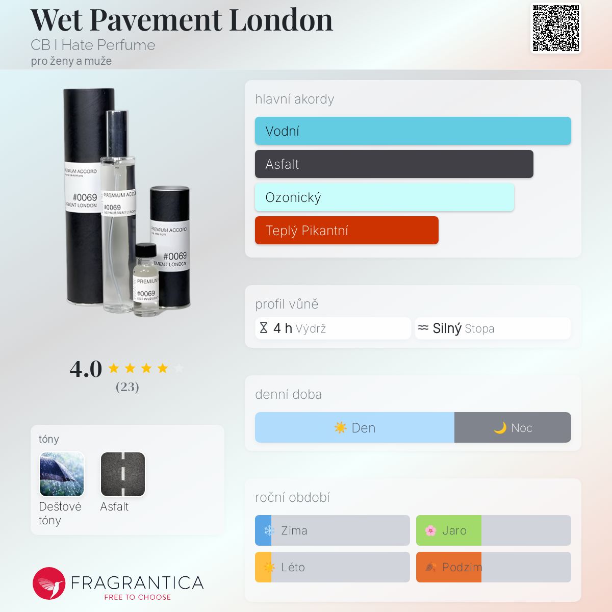 Wet Pavement London podle CB I Hate Perfume je Aromatic Aquatic vůně pro ženy a muže. Wet Pavement London byl/a uveden/a v roce 2014. "Nosem" za touto vůní je Christopher Brosius.