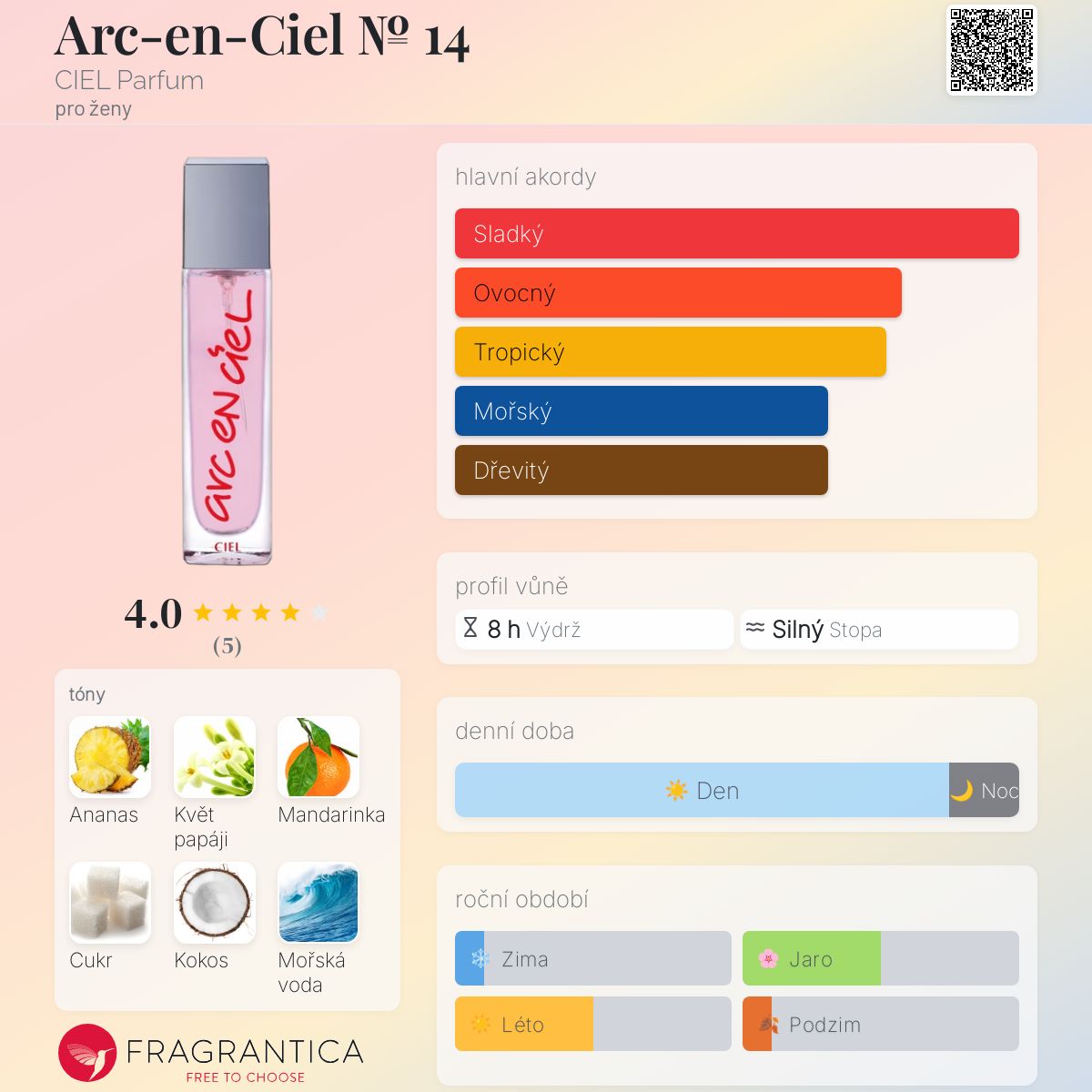 Arc-en-Ciel № 14 podle CIEL Parfum je Floral Fruity vůně pro ženy. Vrchní tóny jsou Ananas, Květ papáji a Mandarinka; střední tóny jsouCukrová třtina, Kokos a Mořská voda ; základní tóny jsou Santalové dřevo a Pižmo.