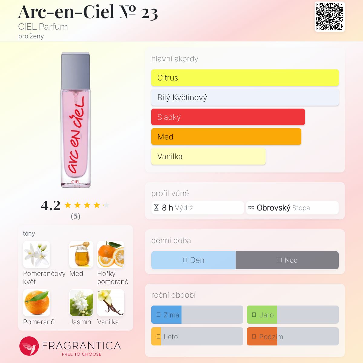 Arc-en-Ciel № 23 podle CIEL Parfum je Citrus vůně pro ženy. Vrchní tóny jsou Hořký pomeranč a Sladký pomeranč; střední tóny jsouPomerančový květ a Jasmín Sambac ; základní tóny jsou Med a Vanilka.