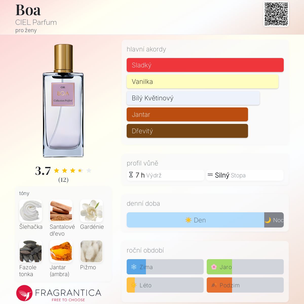 Boa podle CIEL Parfum je Floral Fruity Gourmand vůně pro ženy. "Nosem" za touto vůní je Jean Jacques. Vrchní tóny jsou Broskev, Grapefruit, Mandarinka a Zázvor; střední tóny jsouGardénie, Lilie a Bílá růže ; základní tóny jsou Šlehačka, Santalové dřevo, Fazole tonka, Jantar (ambra) a Pižmo.