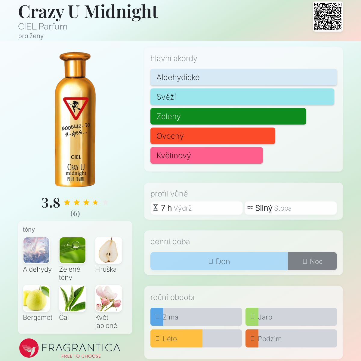 Crazy U Midnight podle CIEL Parfum je Floral Fruity vůně pro ženy. "Nosem" za touto vůní je Sylvie Fischer. Vrchní tóny jsou Zelené tóny, Hruška, Bergamot a Čaj; střední tóny jsouKvět jabloně , Pivoňka a Jasmín ; základní tóny jsou Aldehydy, Pižmo a Santalové dřevo.
