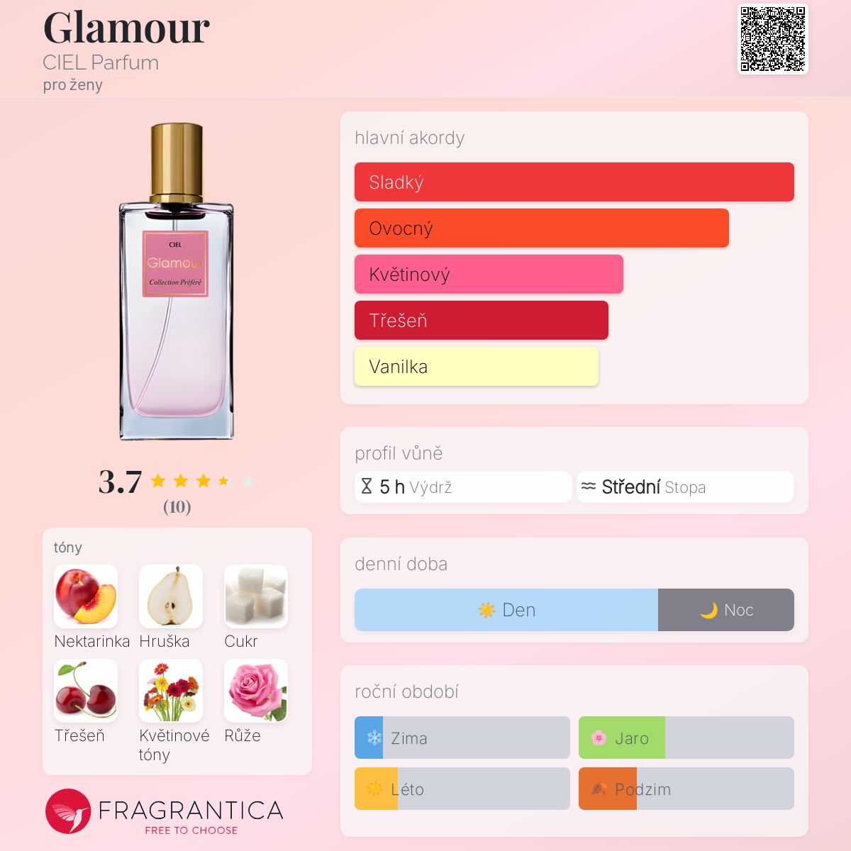 Glamour podle CIEL Parfum je Floral Fruity vůně pro ženy. "Nosem" za touto vůní je Remi Barbier. Vrchní tóny jsou Nektarinka, Hruška a Třešeň; střední tóny jsouKvětinové tóny, Růže, Černý rybíz a Maliny ; základní tóny jsou Cukr, Pižmo, Vanilka a Dřevité tóny.