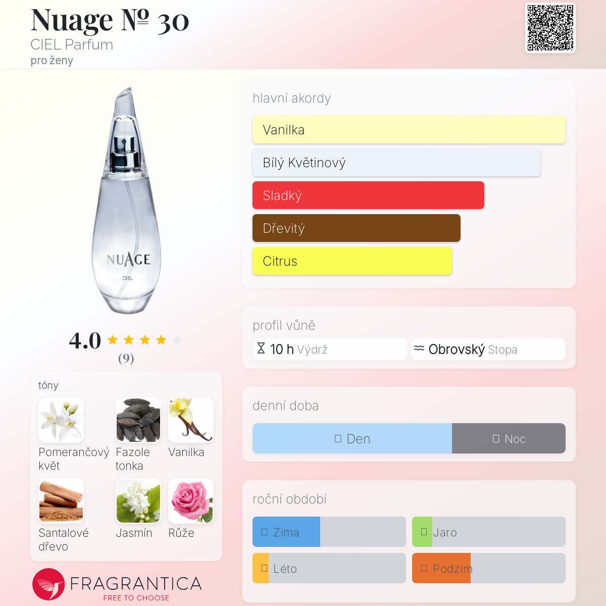 Nuage № 30 podle CIEL Parfum je Orientální Floral vůně pro ženy. Vrchní tóny jsou Mandarinkový list a Květ hedvábného stromu; střední tóny jsouPomerančový květ, Jasmín a Růže ; základní tóny jsou Fazole tonka, Vanilka a Santalové dřevo.