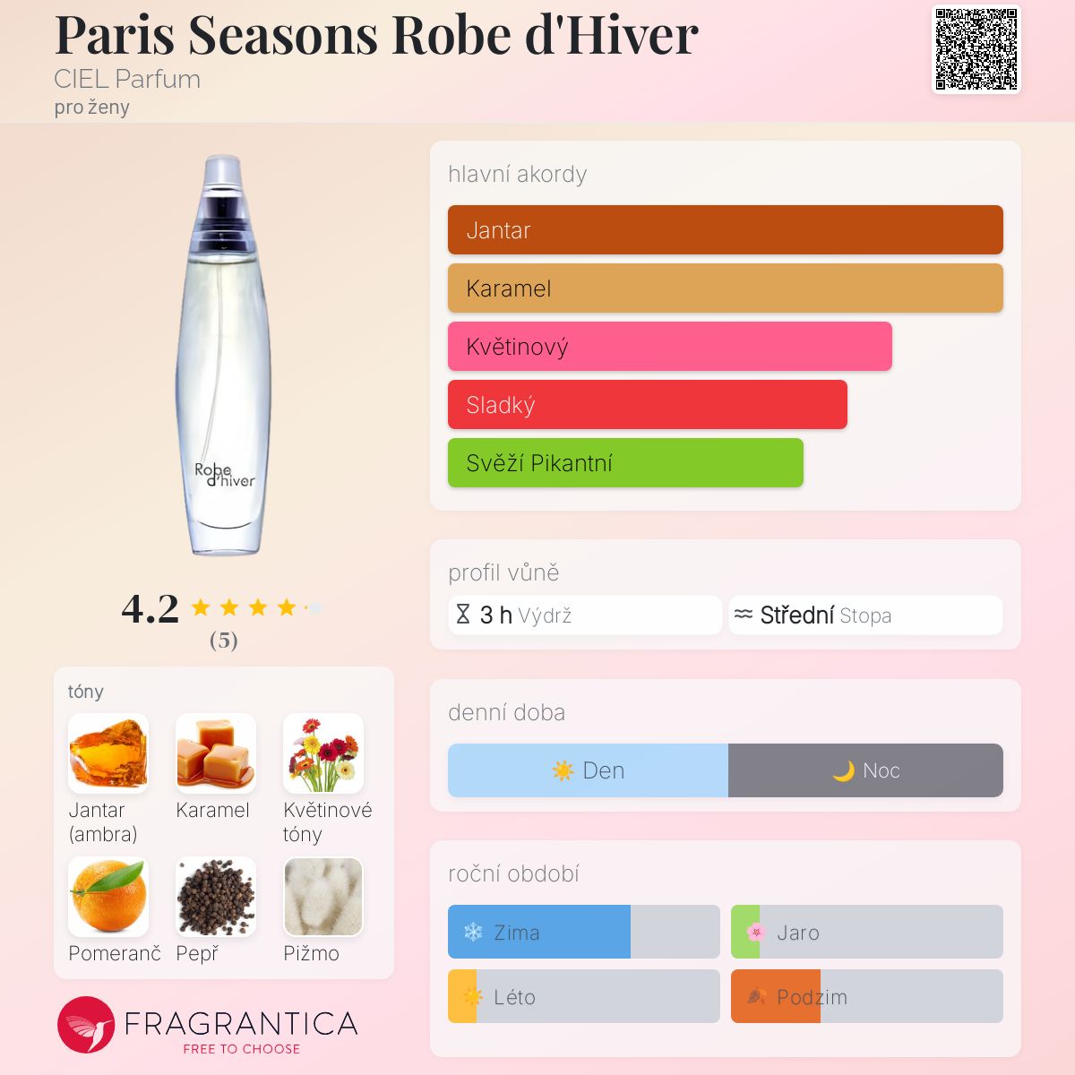 Paris Seasons Robe d'Hiver podle CIEL Parfum je Orientální vůně pro ženy. Vrchní tóny jsou Jantar (ambra) a Pomeranč; střední tóny jsouKvětinové tóny a Pepř ; základní tóny jsou Jantar (ambra), Karamel a Pižmo.