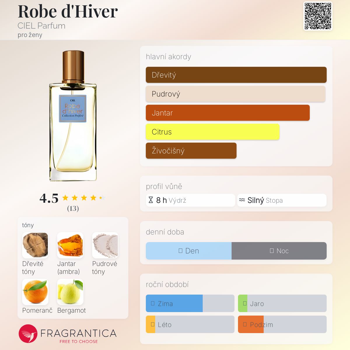 Robe d'Hiver podle CIEL Parfum je Orientální vůně pro ženy. Vrchní tóny jsou Sladký pomeranč a Bergamot; střední tón jeDřevité tóny ; základní tóny jsou Jantar (ambra) a Pudrové tóny.
