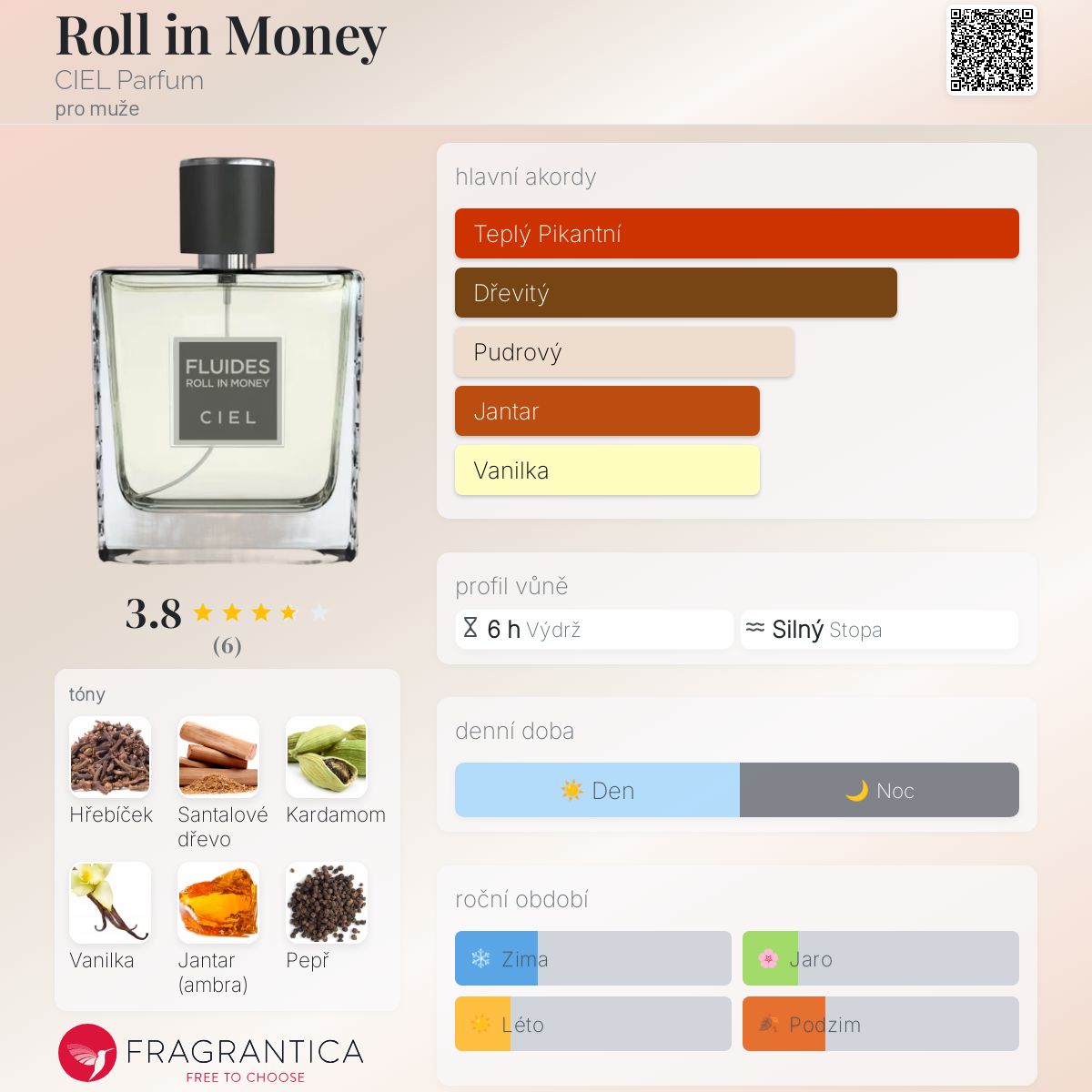 Roll in Money podle CIEL Parfum je Woody Spicy vůně pro muže. Roll in Money byl/a uveden/a v roce 2020. "Nosem" za touto vůní je Paulo de Moraes. Vrchní tóny jsou Kardamom, Pepř a Citrusy; střední tóny jsouHřebíček, Santalové dřevo, Pačuli a Cedr ; základní tóny jsou Vanilka a Jantar (ambra).