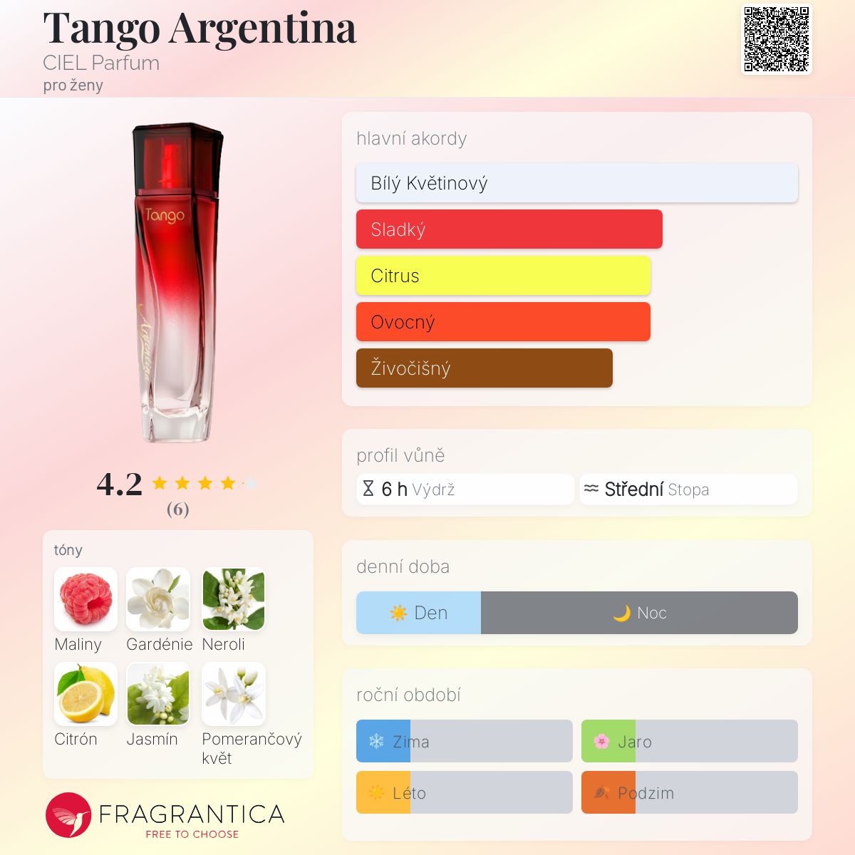 Tango Argentina podle CIEL Parfum je Orientální Floral vůně pro ženy. Vrchní tóny jsou Maliny, Neroli a Citrón; střední tóny jsouGardénie, Jasmín Sambac a Pomerančový květ ; základní tóny jsou Med, Ambra a Pačuli.