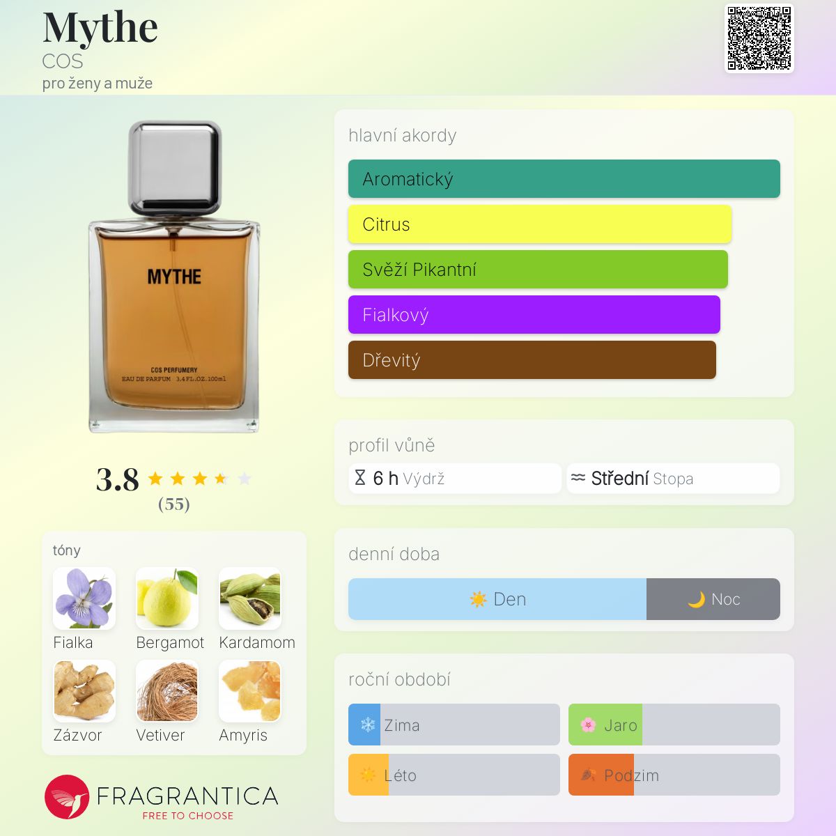 Mythe podle COS je Aromatic Spicy vůně pro ženy a muže. Toto je nová vůně. Mythe byl/a uveden/a v roce 2025. "Nosem" za touto vůní je Nathalie Lorson. Vrchní tóny jsou Bergamot, Kardamom a Zázvor; střední tón jeVetiver ; základní tóny jsou Fialka a Amyris.