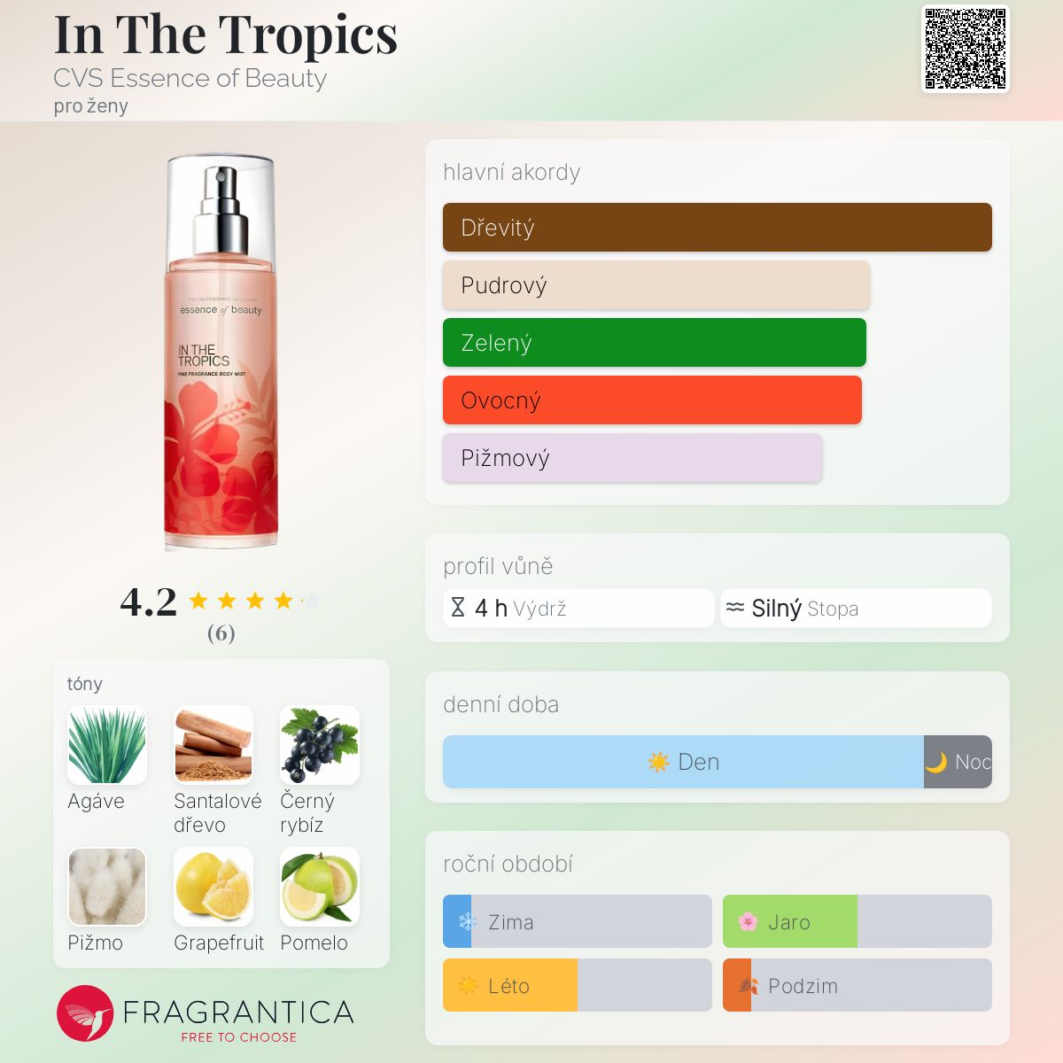 In The Tropics podle CVS Essence of Beauty je Floral Fruity Gourmand vůně pro ženy. In The Tropics byl/a uveden/a v roce 2013. "Nosem" za touto vůní je Shinta Judana. Vrchní tóny jsou Černý rybíz, Růžový grapefruit a Pomelo; střední tóny jsouAgáve, Růže a Brambořík ; základní tóny jsou Santalové dřevo a Pižmo.