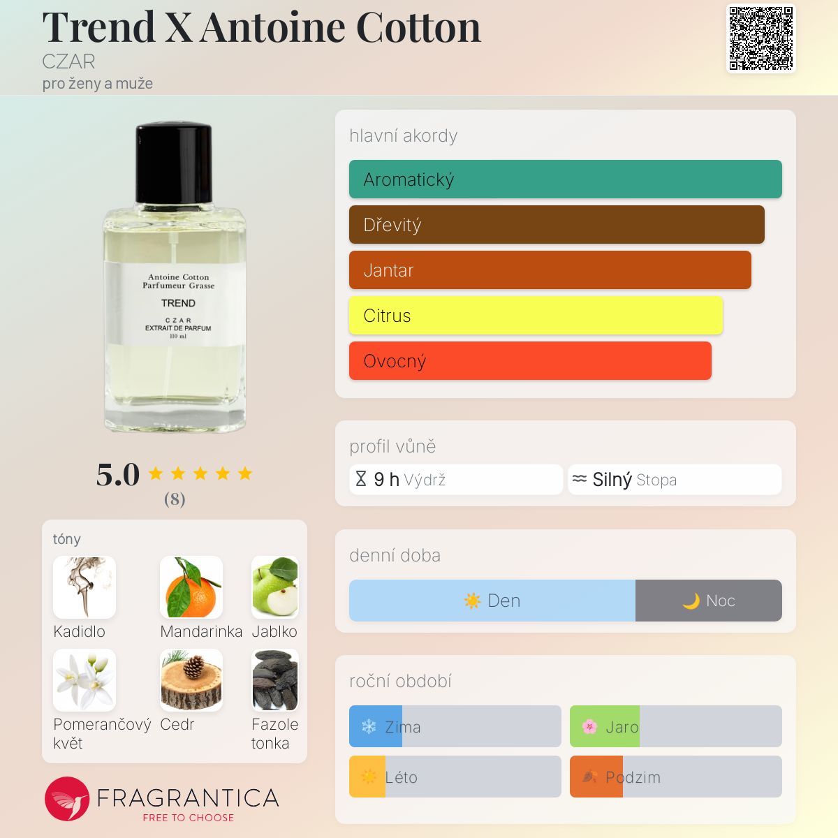 Trend X Antoine Cotton podle CZAR je Woody Aromatic vůně pro ženy a muže. Toto je nová vůně. Trend X Antoine Cotton byl/a uveden/a v roce 2025. "Nosem" za touto vůní je Antoine Cotton. Vrchní tóny jsou Mandarinka, Jablko, Rebarbora a Aldehydy; střední tóny jsouPomerančový květ, Levandule, Rozmarýn, Orris a Tymián ; základní tóny jsou Kadidlo, Cedr, Fazole tonka, Pačuli a Vanilka.