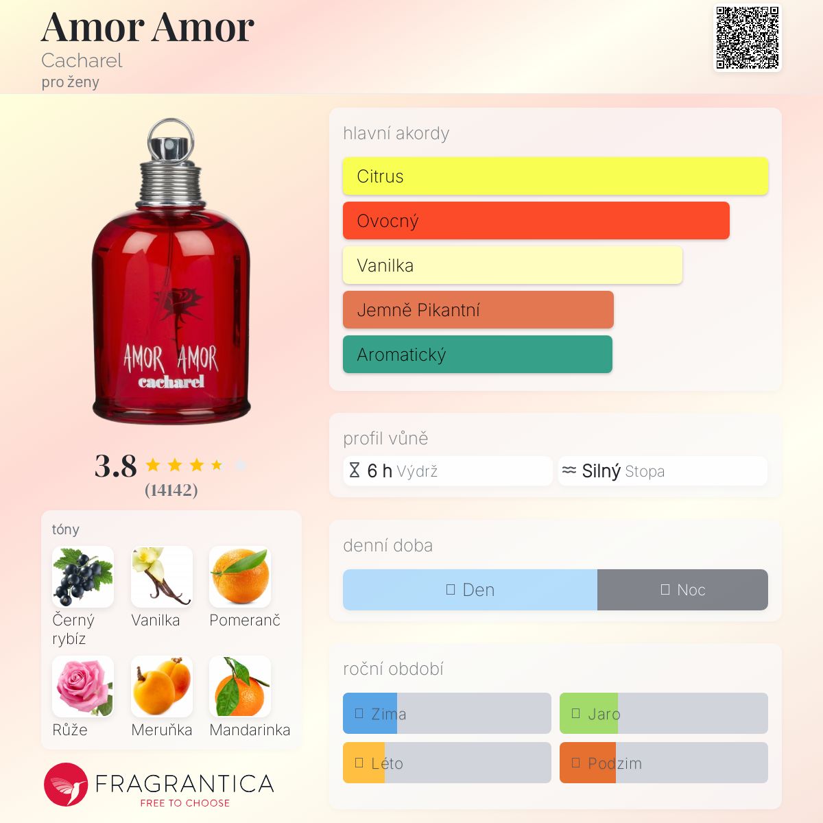 Amor Amor podle Cacharel je Floral Fruity vůně pro ženy. Amor Amor byl/a uveden/a v roce 2003. Amor Amor byl/a vytvořen/a Laurent Bruyere a Dominique Ropion. Vrchní tóny jsou Černý rybíz, Pomeranč, Mandarinka, Grapefruit, Kasie a Bergamot; střední tóny jsouRůže, Meruňka, Jasmín, Lilie a Konvalinka ; základní tóny jsou Vanilka, Fazole tonka, Pižmo, Jantar (ambra) a Virginský cedr.