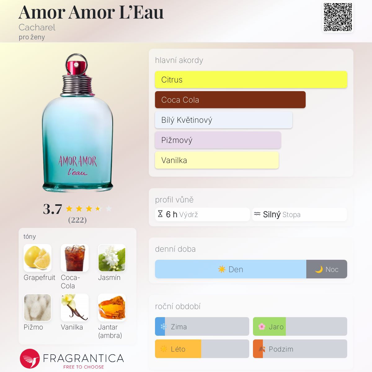 Amor Amor L’Eau podle Cacharel je Floral Fruity vůně pro ženy. Amor Amor L’Eau byl/a uveden/a v roce 2014. Vrchní tóny jsou Grapefruit a Coca-Cola; střední tóny jsouJasmín a Růže ; základní tóny jsou Pižmo, Vanilka a Jantar (ambra).