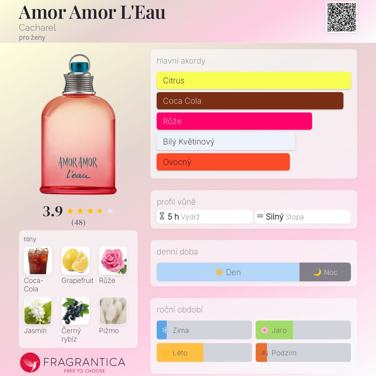 Amor Amor L'Eau podle Cacharel je Floral Fruity vůně pro ženy. Amor Amor L'Eau byl/a uveden/a v roce 2015. Vrchní tóny jsou Coca-Cola, Grapefruit a Černý rybíz; střední tóny jsouRůže a Jasmín ; základní tóny jsou Pižmo a Vanilka.