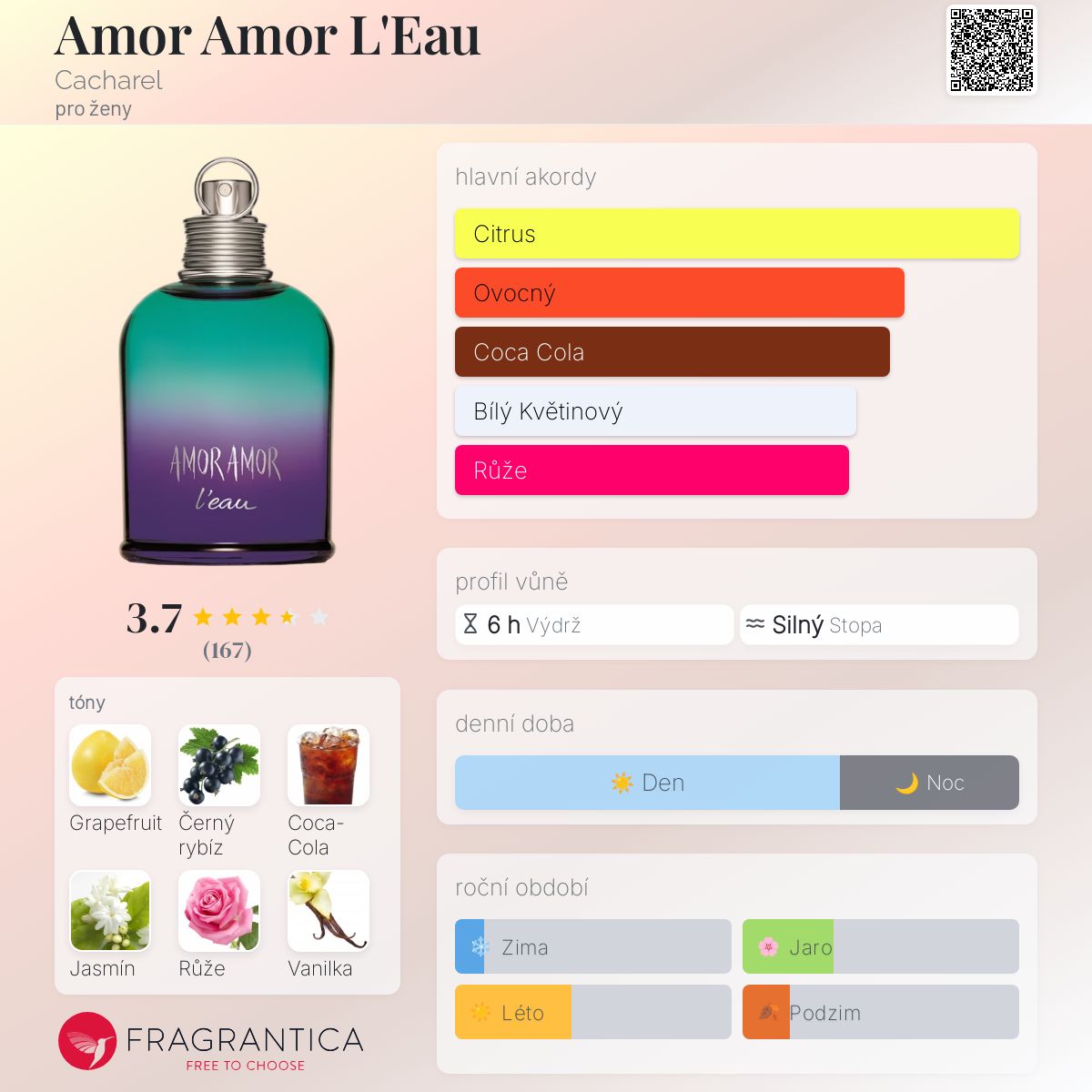 Amor Amor L'Eau podle Cacharel je Floral Fruity vůně pro ženy. Amor Amor L'Eau byl/a uveden/a v roce 2016. Vrchní tóny jsou Grapefruit, Černý rybíz a Coca-Cola; střední tóny jsouJasmín a Růže ; základní tóny jsou Vanilka, Jantar (ambra) a Pižmo.