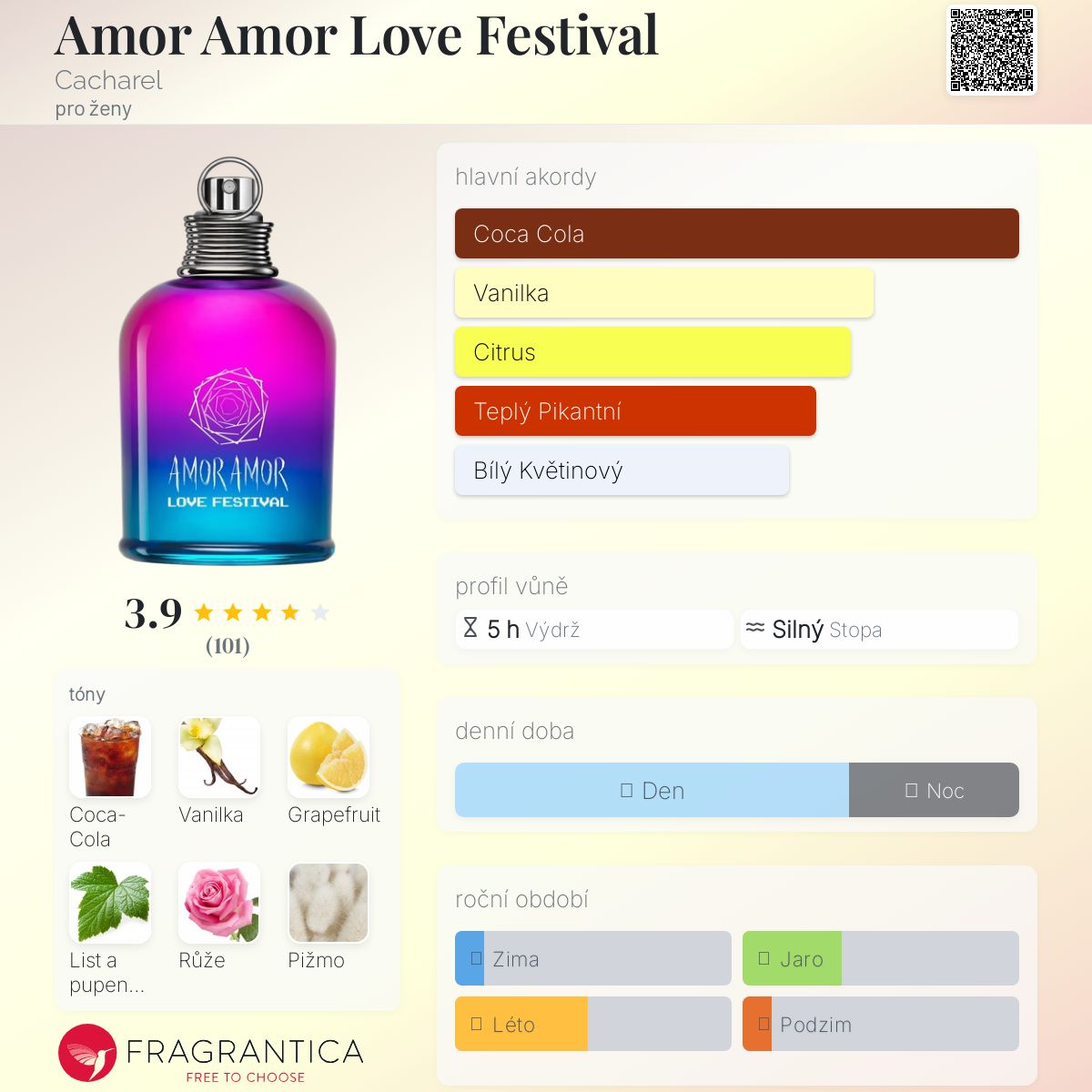 Amor Amor Love Festival podle Cacharel je Floral Fruity Gourmand vůně pro ženy. Amor Amor Love Festival byl/a uveden/a v roce 2020. Vrchní tóny jsou Coca-Cola, Grapefruit a Černý rybíz; střední tóny jsouRůže, Jasmín a Konvalinka ; základní tóny jsou Vanilka, Pižmo a Cedr.
