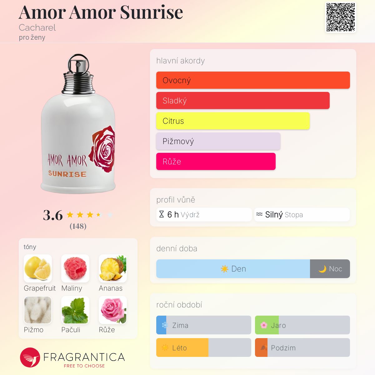 Amor Amor Sunrise podle Cacharel je Chypre Fruity vůně pro ženy. Amor Amor Sunrise byl/a uveden/a v roce 2009. "Nosem" za touto vůní je Laurent Bruyere. Vrchní tóny jsou Grapefruit a Maliny; střední tóny jsouAnanas a Růže ; základní tóny jsou Pižmo, Pačuli a Jantar (ambra).