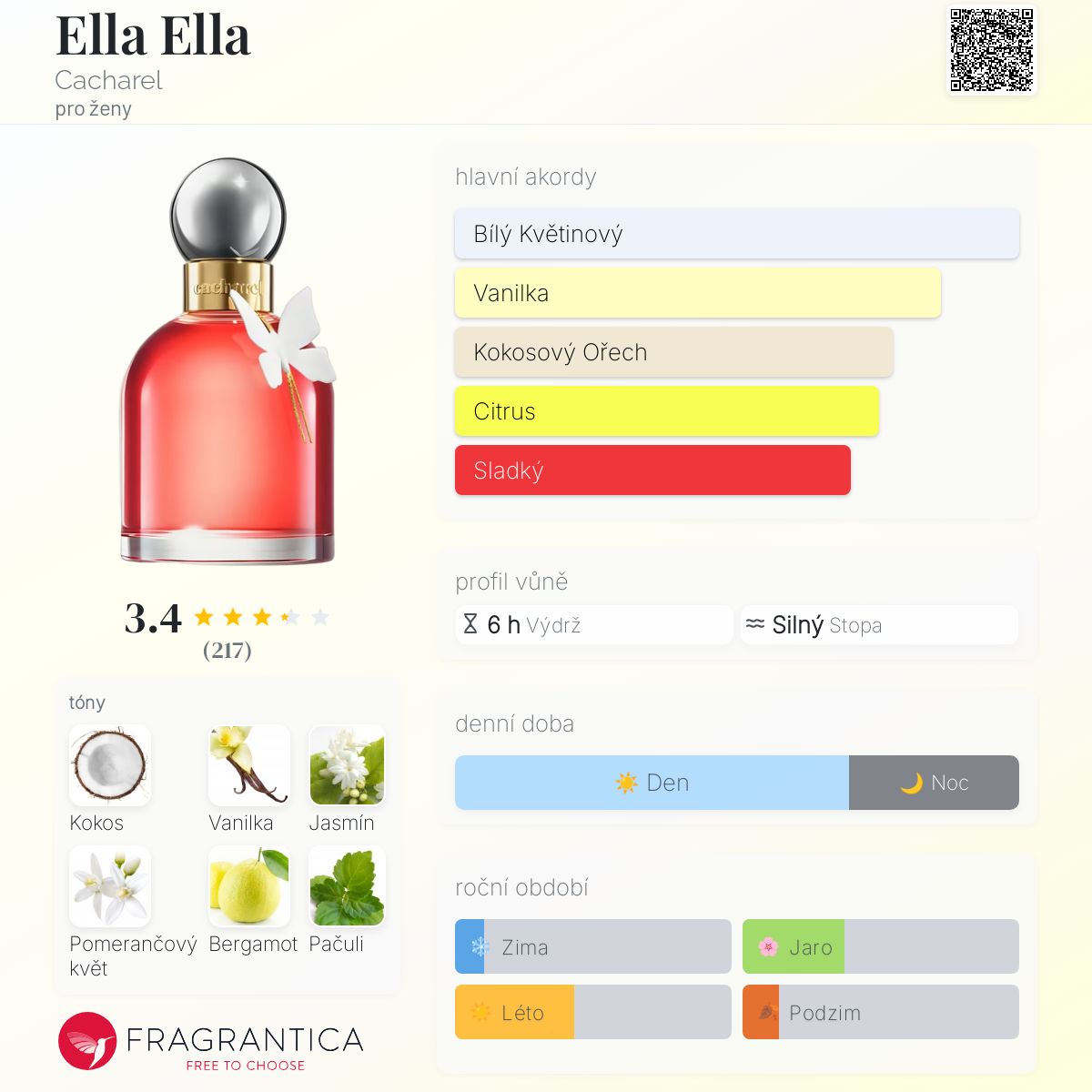Ella Ella podle Cacharel je Floral Fruity Gourmand vůně pro ženy. Toto je nová vůně. Ella Ella byl/a uveden/a v roce 2025. "Nosem" za touto vůní je Dominique Ropion. Vrchní tóny jsou Kokos a Bergamot; střední tóny jsouJasmín Sambac a Pomerančový květ ; základní tóny jsou Bourbonská vanilka a Pačuli.