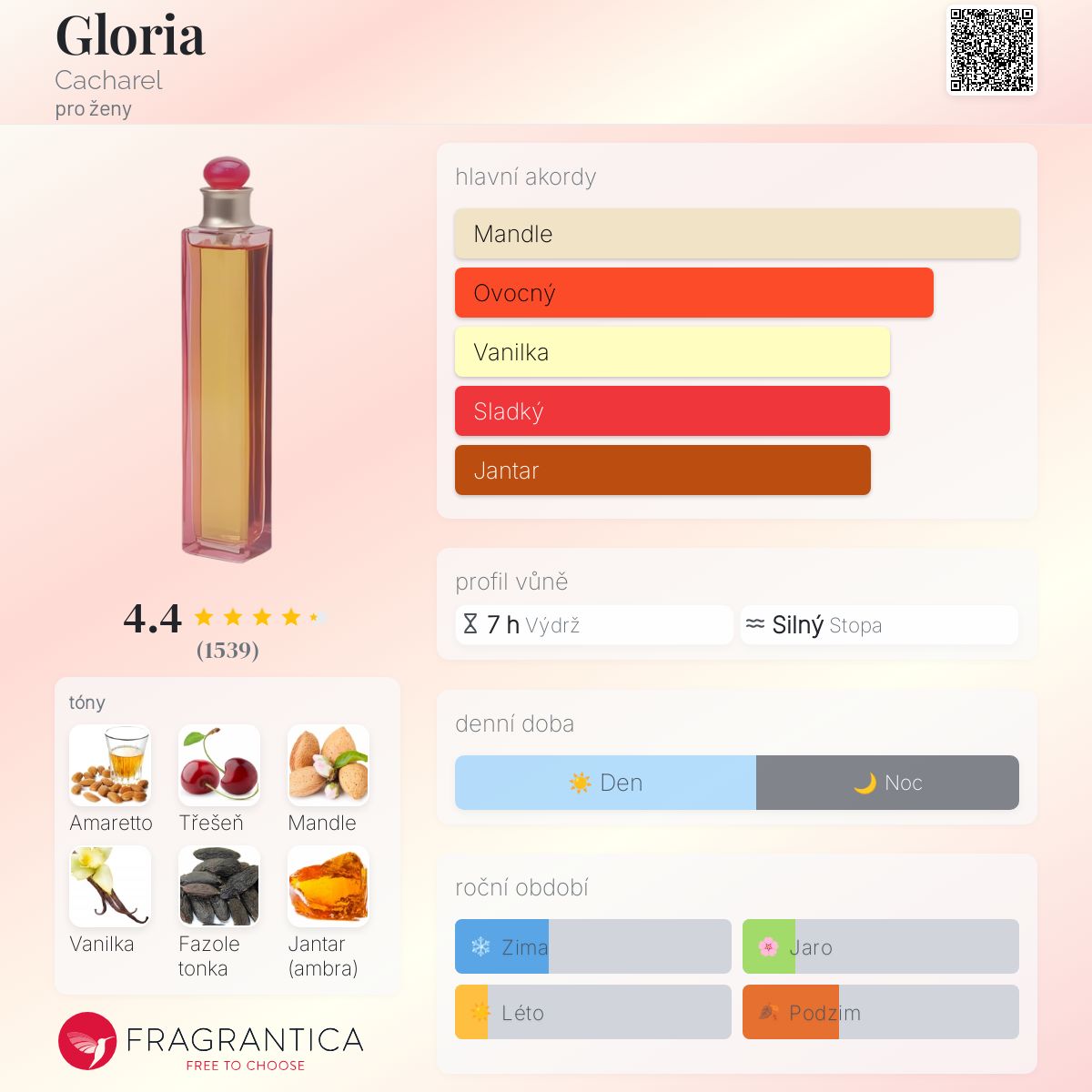 Gloria podle Cacharel je Orientální Woody vůně pro ženy. Gloria byl/a uveden/a v roce 2002. "Nosem" za touto vůní je Olivier Cresp. Vrchní tóny jsou Amaretto, Jantar (ambra), Ibišek a Bulharská růže; střední tóny jsouVanilka, Jantar (ambra), Bílý pepř a Bílé květy ; základní tóny jsou Třešeň, Mandle, Fazole tonka, Styrax a Cedr.