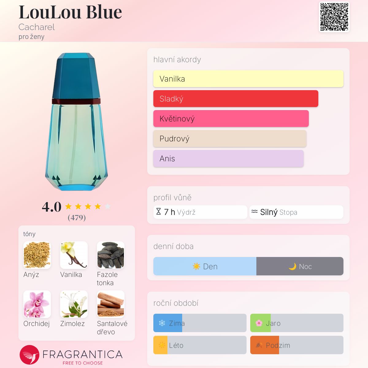 LouLou Blue podle Cacharel je Orientální Floral vůně pro ženy. LouLou Blue byl/a uveden/a v roce 1995. Vrchní tóny jsou Anýz, Zelené tóny, Broskev a Bergamot; střední tóny jsouOrchidej, Zimolez, Kořen orris a Frézie ; základní tóny jsou Vanilka, Fazole tonka, Santalové dřevo a Vetiver.