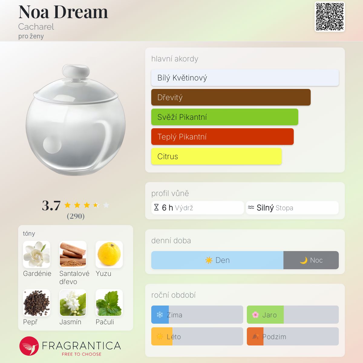 Noa Dream podle Cacharel je Chypre Floral vůně pro ženy. Noa Dream byl/a uveden/a v roce 2009. "Nosem" za touto vůní je Olivier Cresp. Vrchní tóny jsou Yuzu, Pepř a Liči; střední tóny jsouGardénie, Jasmín a Broskev ; základní tóny jsou Santalové dřevo, Pačuli a Jantar (ambra).