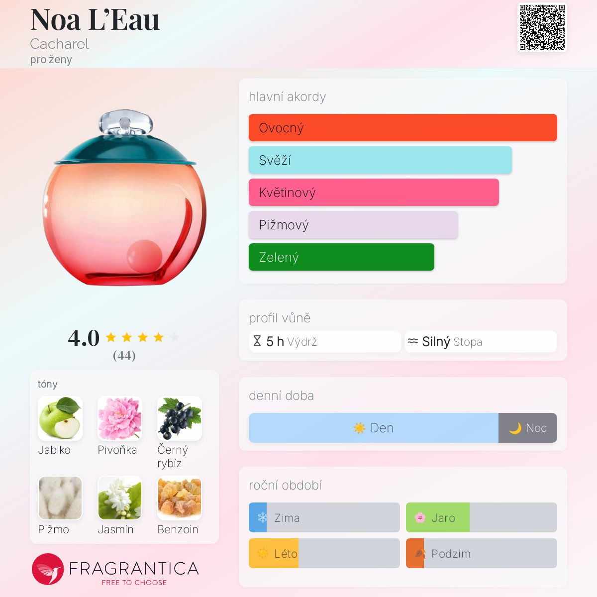 Noa L’Eau podle Cacharel je Floral Fruity vůně pro ženy. Noa L’Eau byl/a uveden/a v roce 2015. Vrchní tóny jsou Zelené jablko a Černý rybíz; střední tóny jsouPivoňka a Jasmín ; základní tóny jsou Bílé pižmo a Benzoin.