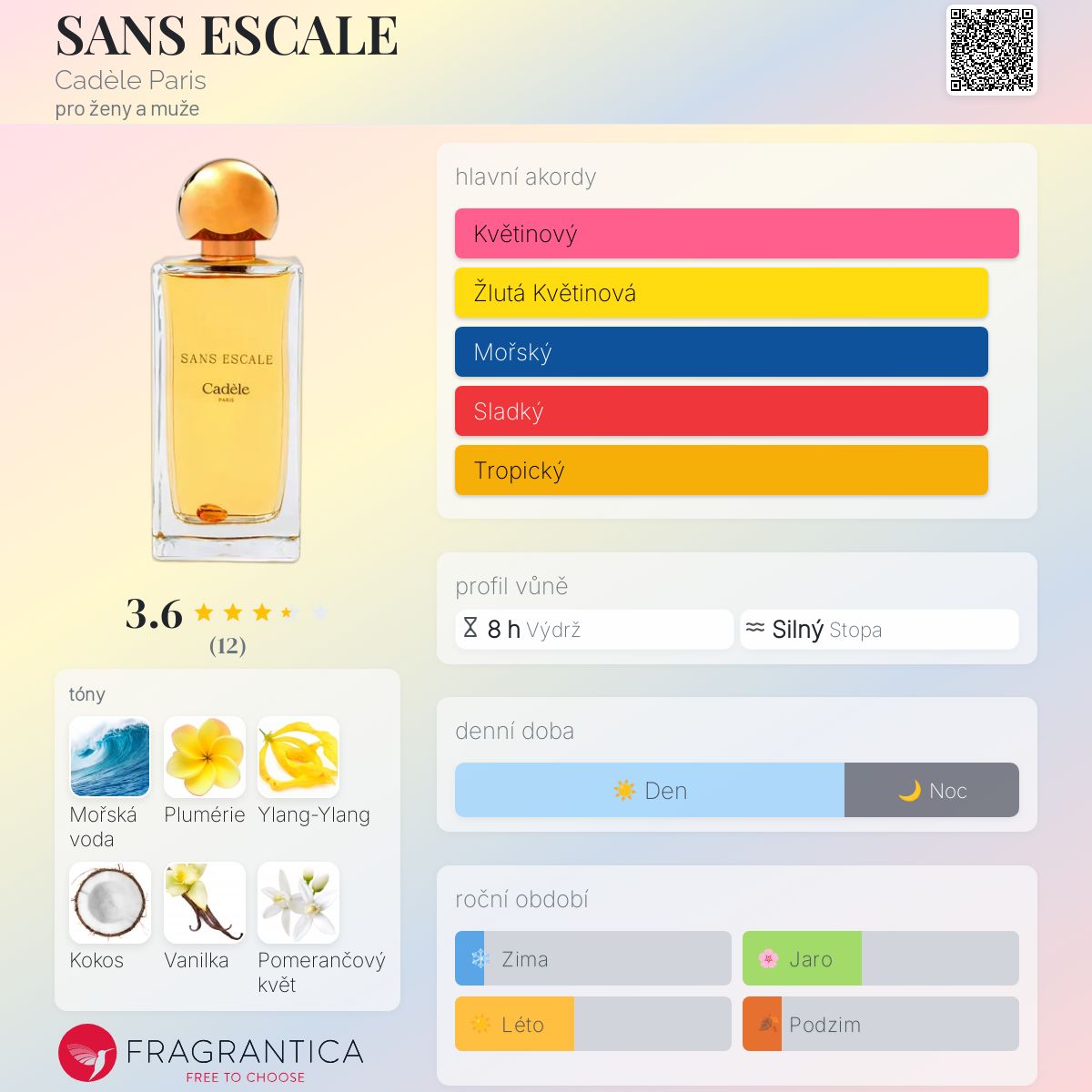 SANS ESCALE podle Cadèle Paris je Floral Aquatic vůně pro ženy a muže. SANS ESCALE byl/a uveden/a v roce 2022. SANS ESCALE byl/a vytvořen/a Amelie Bourgeois a Anne-Sophie Behaghel. Vrchní tóny jsou Mořské tóny, Plumérie a Kokos; střední tóny jsouYlang-Ylang, Pomerančový květ a Tuberóza ; základní tóny jsou Vanilka a Bílé pižmo.