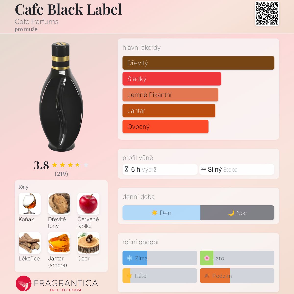 Cafe Black Label podle Cafe Parfums je Orientální Woody vůně pro muže. Cafe Black Label byl/a uveden/a v roce 2010. Vrchní tóny jsou Koňak, Červené jablko a Pomeranč; střední tóny jsouVirginský cedr a Květinové tóny ; základní tóny jsou Dřevité tóny, Lékořice a Jantar (ambra).