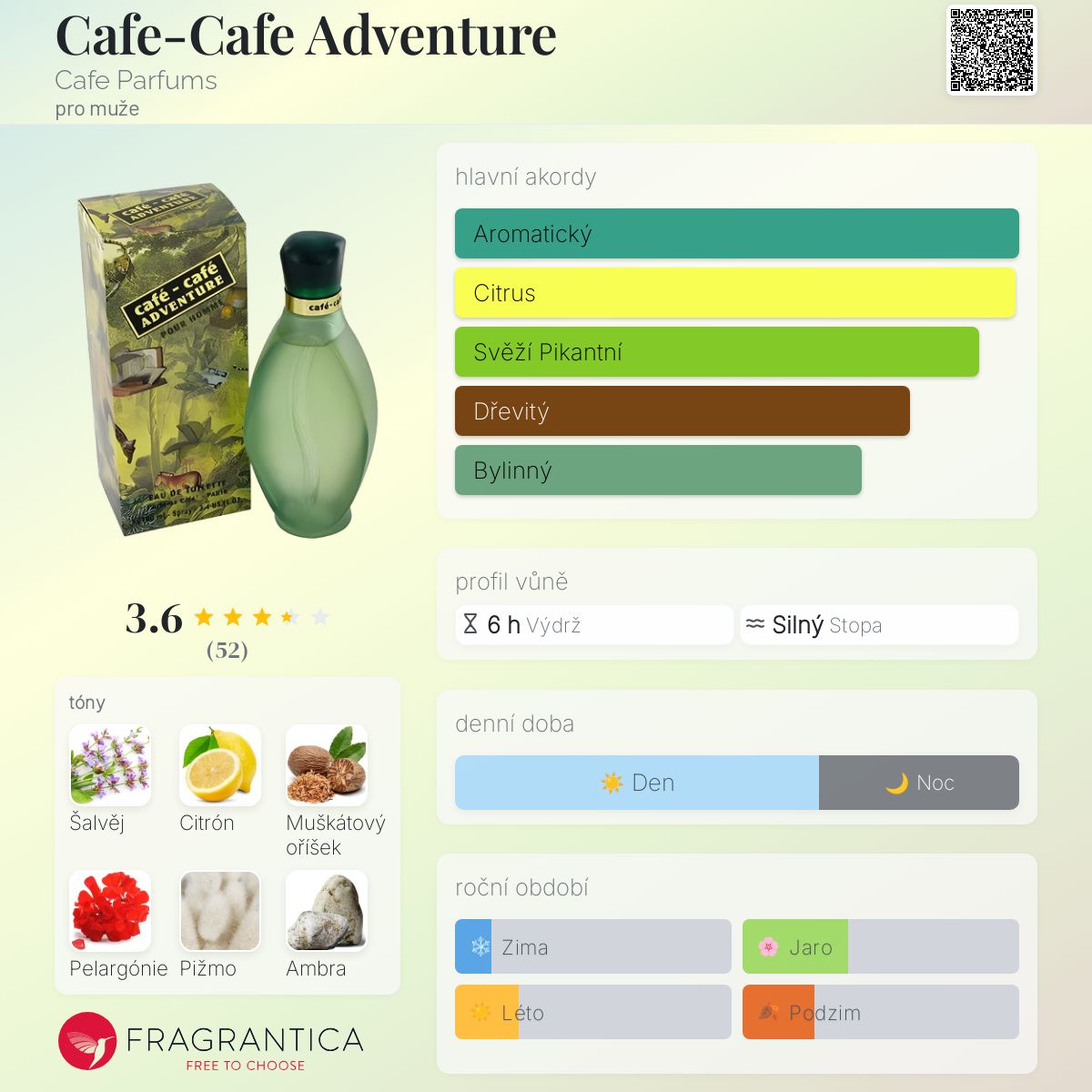 Cafe-Cafe Adventure podle Cafe Parfums je Woody Aromatic vůně pro muže. Cafe-Cafe Adventure byl/a uveden/a v roce 2000. "Nosem" za touto vůní je Henri Bergia. Vrchní tóny jsou Šalvěj, Citrón, Bergamot a Mandarinka; střední tóny jsouMuškátový oříšek, Pelargónie, Jasmín, Palisandr a Konvalinka ; základní tóny jsou Pižmo, Ambra, Santalové dřevo a Cedr.