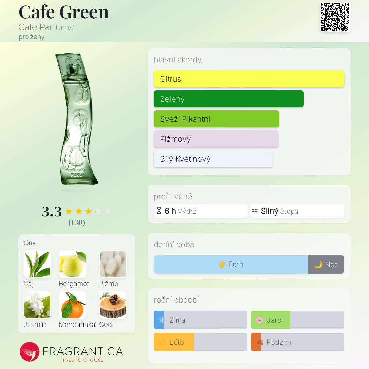 Cafe Green podle Cafe Parfums je Floral vůně pro ženy. Cafe Green byl/a uveden/a v roce 2008. Vrchní tóny jsou Bergamot, Mandarinka, Hruška a Broskev; střední tóny jsouČaj, Jasmín a Růže ; základní tóny jsou Pižmo a Virginský cedr.
