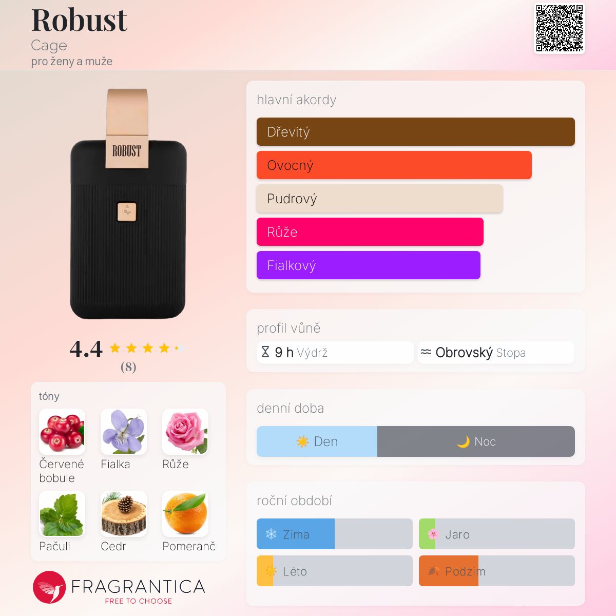 Robust podle Cage je Floral Fruity vůně pro ženy a muže. Robust byl/a uveden/a v roce 2019. Vrchní tóny jsou Červené bobule, Pomeranč, Jablko, Bergamot a Citrón; střední tóny jsouFialka, Růže, Pelyněk a Jasmín ; základní tóny jsou Pačuli, Cedr, Pižmo, Agarové dřevo (oud) a Vetiver.